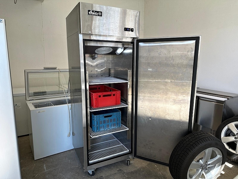 | VHODNÁ I NA VELKÉ PŘEPRAVKY viz foto. Velká profesionální značková gastro chladnice. Objem 670 litrů. Velká chladící schopnost - rychle vychladí vnitřní prostor. Displej. Nastavení a zobrazení vnitřní teploty na displeji. Kastle a vnitřek z nerezu. Systém chlazení dynamický - vnitřní ventilátor. Vnitřní osvětlení. Samozavírací dveře. Nosnost polic 40 kg. Vnější rozměry: Hloubka 81 cm. Šířka 73 cm. Výška 206 cm. Hmotnost 120 kg. Pojízdná na kolečkách s brzdou. Použitá. Čistá. Plně funkční. Předvedu. Možno dovézt.