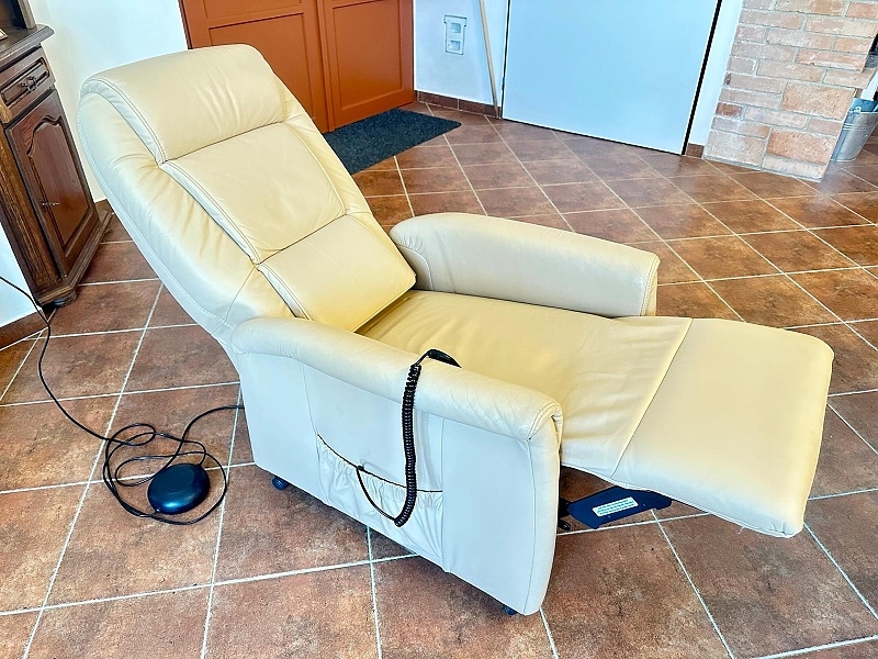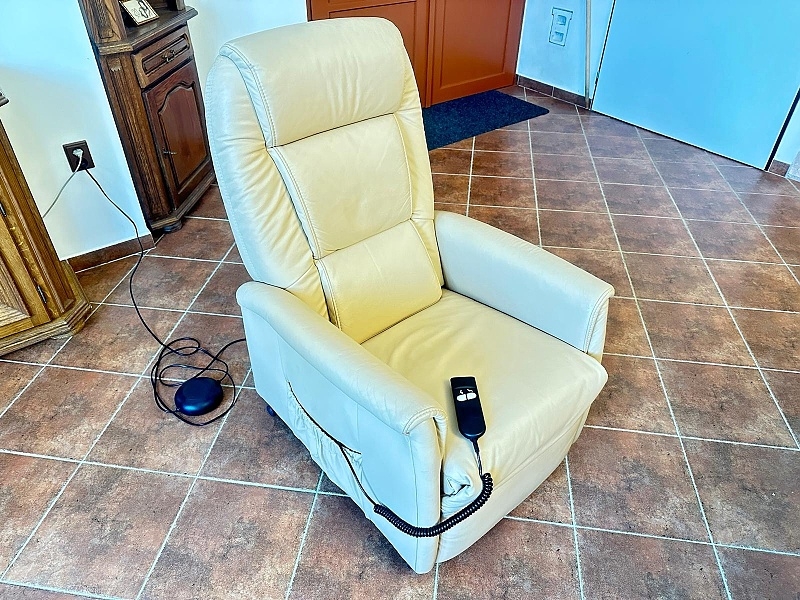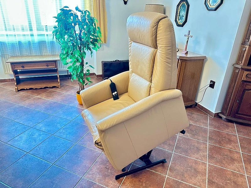 | Křeslo má elektromotor s ovladačem k polohování sezení, vysunutí podnožníku a výklop k postavení sedícího - ideální pro člověka se sníženou schopností pohybu. Hloubka 78 cm. Šířka 68 cm. Výška 105 cm.