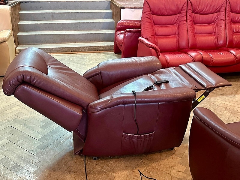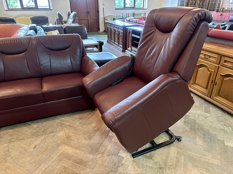 | Luxusní velmi pohodlná sedačka. Křeslo s motorem - el. polohováním: Hloubka 88 cm. Šířka 89 cm. Výška 108 cm. Toto křeslo má elektromotor s ovladačem k polohování sezení + přednožník + výklop k postavení sedícího - ideální pro člověka se sníženou schopností pohybu. Na kolečkách.