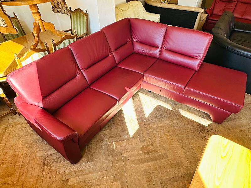 | Hloubka 217 cm. Šířka 236 cm. Výška 96 cm Úložný prostor. Barva vínová. Vysoká sedačka. Pravá kůže. Málo používaná, velmi dobrý stav. Použité zboží. Možno dovézt.