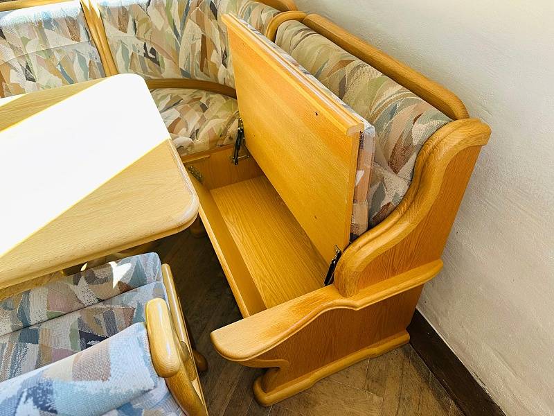 | Jako nové. Kvalitní masivní provedení z tvrdého dřeva. Lavice má 2 úložné prostory. Stůl je rozkládací. 2 židle + 1 křeslo s opěrkami loktů. Lavice a stůl se dají rozšroubovat rozložit. Rozměry lavice: Hloubka 165 cm. Šířka 205 cm. Výška 90 cm.