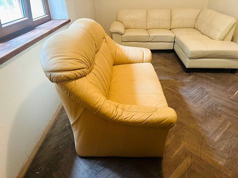 Vysoké opěradlo. Barva béžová. Pravá kůže. Použité zboží.