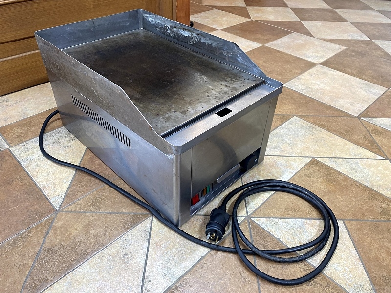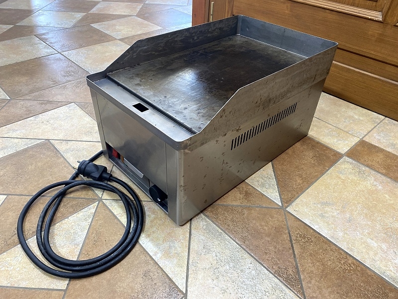 | Česká výroba. Nahoře žlábek na odtékání oleje. Dole výsuvná mistička na odteklý olej. Hlavní vypínač. Regulační termostat teploty desky. Připojení do zásuvky 230 V. Deska je hladká bez vrypů.