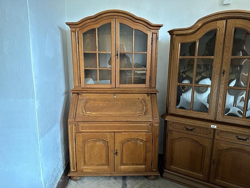 | Horní kus volně postavený na dolním (2 kusy zvlášť - lehce přenosné). Výklopný sekretář s uzamykáním s klíčkem. Hloubka 48 cm. Šířka 113 cm. Výška 201 cm.