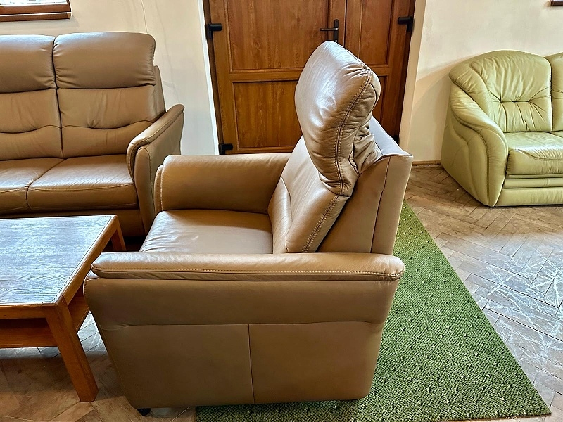 | NOVÁ STOJÍ OKOLO 5000 Euro. Křesla: Jedno z křesel má plynulé el. polohování (napájení ze zásuvky + vlastní akumulátor) do relaxační polohy viz foto (čtyřmi tlačítky na boku sedáku vpravo, nejsou vidět). Obě křesla mají polohovací opěrku hlavy. Obě křesla jsou na kolečkách. Hloubka 94 cm. Šířka 88 cm. Výška 105/117 cm. Trojsedák: Trojsedák má plynulý el. výsuv viz foto (napájení ze zásuvky) ke zvětšení sedací plochy (dvěmi tlačítky na boku sedáku vpravo, nejsou vidět). 3 polohovací opěrky hlavy. Hloubka 95 cm. Šířka 202 cm. Výška 102/117 cm. Vysoká sedačka. Velmi pohodlná. Barva světle hnědá. Pravá kůže. Použité zboží. Možno dovézt. 26990 Kč. Volat předem na tel.: 777 647 827. |