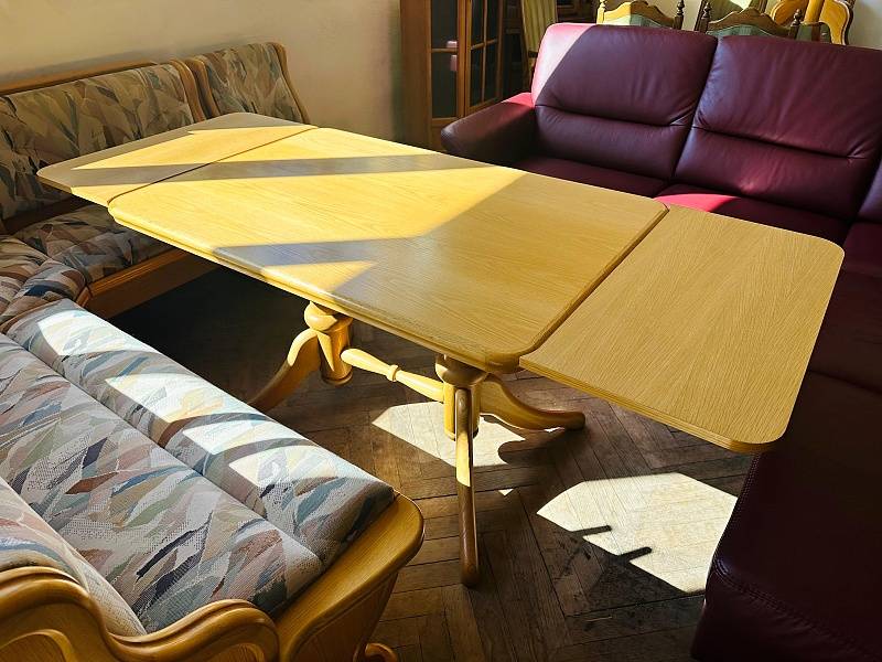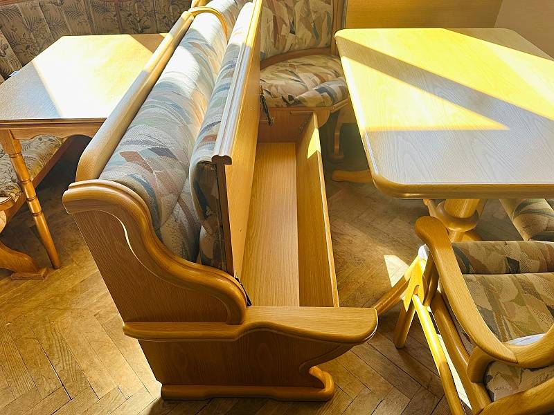 | Jako nové. Kvalitní masivní provedení z tvrdého dřeva. Lavice má 2 úložné prostory. Stůl je rozkládací. 2 židle + 1 křeslo s opěrkami loktů. Lavice a stůl se dají rozšroubovat rozložit. Rozměry lavice: Hloubka 165 cm. Šířka 205 cm. Výška 90 cm.