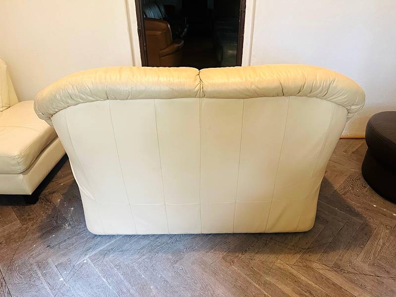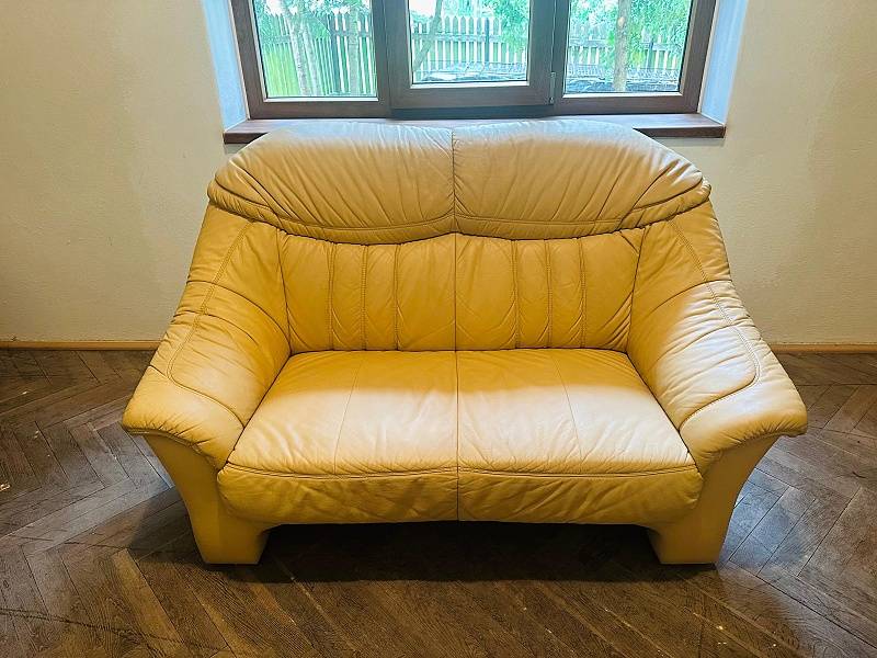 Vysoké opěradlo. Barva béžová. Pravá kůže. Použité zboží.