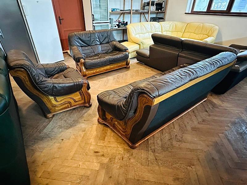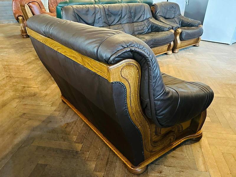 Pravá kůže v kombinaci s ozdobným frézovaným dřevem - tvrdé dřevo - masiv. Vhodná i k umístění do prostoru - vzadu a z boku kůže/látka s ozdobnými čalounickými cvočky (hřeby). Snadná manipulace – sedací části lze vyjmout. Barva tmavě hnědá. Vysoká sedačka. Pravá kůže. Použité zboží.