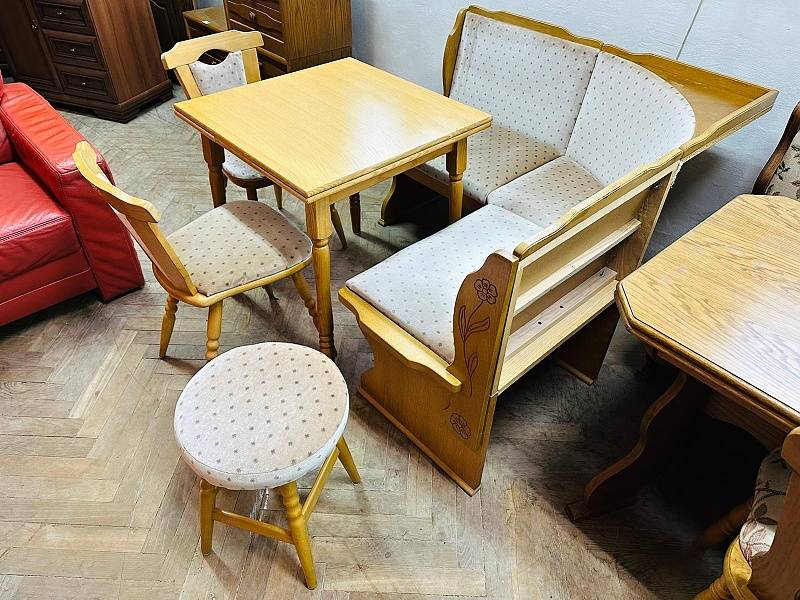 730 Rustikální jídelní set rohová lavice rozkládací stůl 2 židle 1 stolička frézovaní masivní provedení