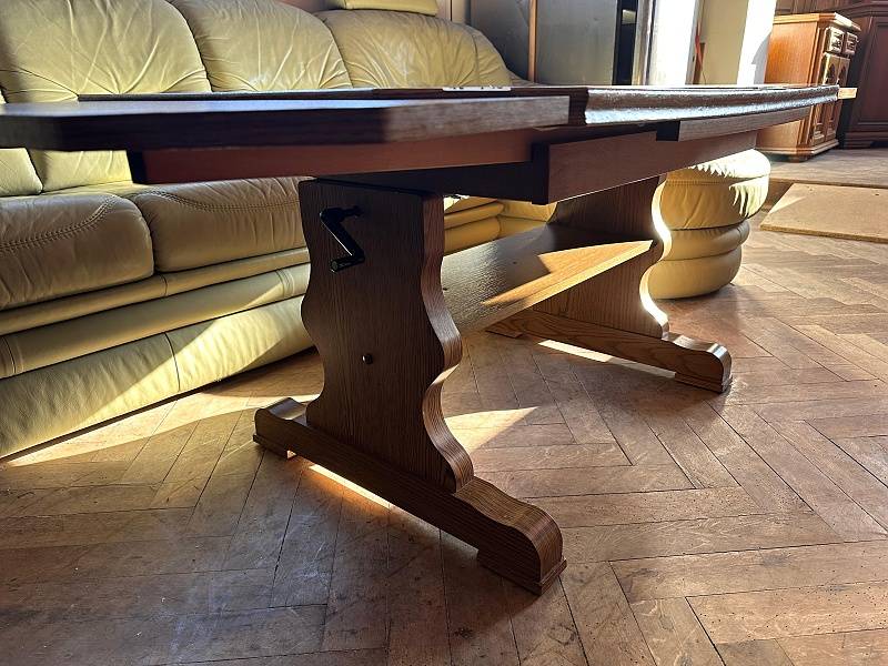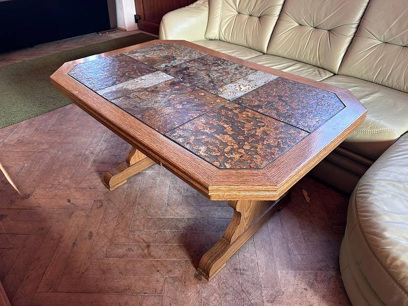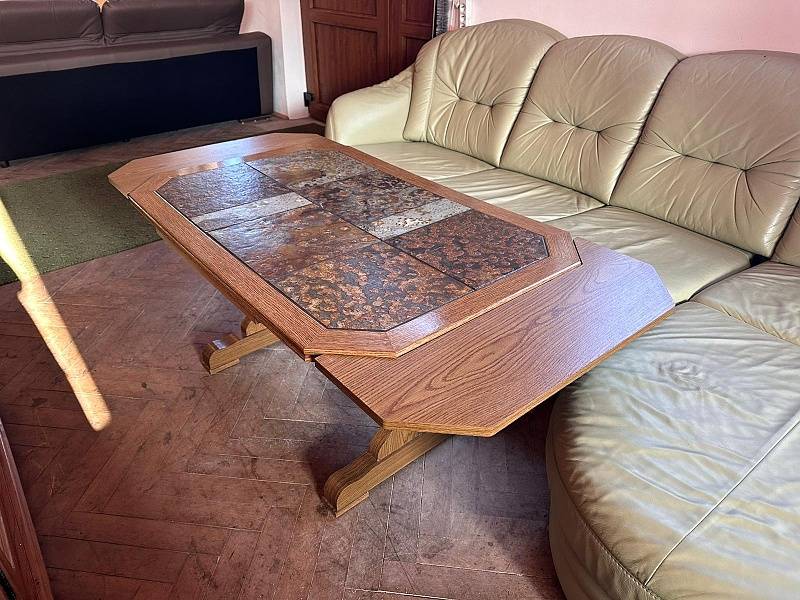 | Nahoře dlažba. Možnost nastavení výšky stolu kličkou umístěnou vespod (zdvih). Vespod odkládací plocha. Možnost zvětšení stolu - rozkládací stůl. Hloubka 74 cm. Šířka 114,5/157 cm. Výška 58 cm. Použité zboží.