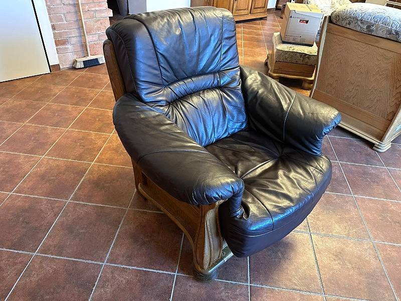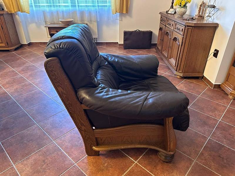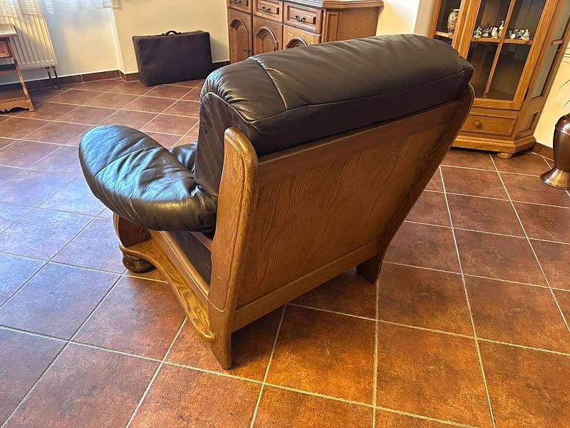 Velmi pohodlné kožené křeslo v kombinaci s tvrdým dřevem (masiv), vhodné k umístění do prostoru - vzadu deska v barvě dřeva. Snadná manipulace – sedací část lze vyjmout. Barva tmavě hnědá. Pravá kůže.